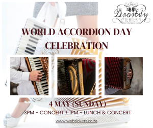 Join us for the Celebration of World Accordion Day in Stellenbosch at the Drostdy Theatre, on 4th May (Sunday). You can expect music from various genres, performed by the top professional accordionists of Cape Town area as well as some young and upcoming accordion students.